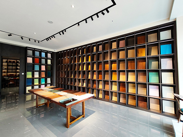 作為本次經銷商大會的壓軸行程,與會嘉賓在午宴后前往山東大寶家具漆服務中心深度考察。步入展廳,極具現(xiàn)代感的色板陣列即刻映入眼簾—木器漆呈現(xiàn)天然肌理之美,金屬涂層閃耀科技光澤,塑膠與玻瓶的表面處理更突破傳統(tǒng)工藝邊界。